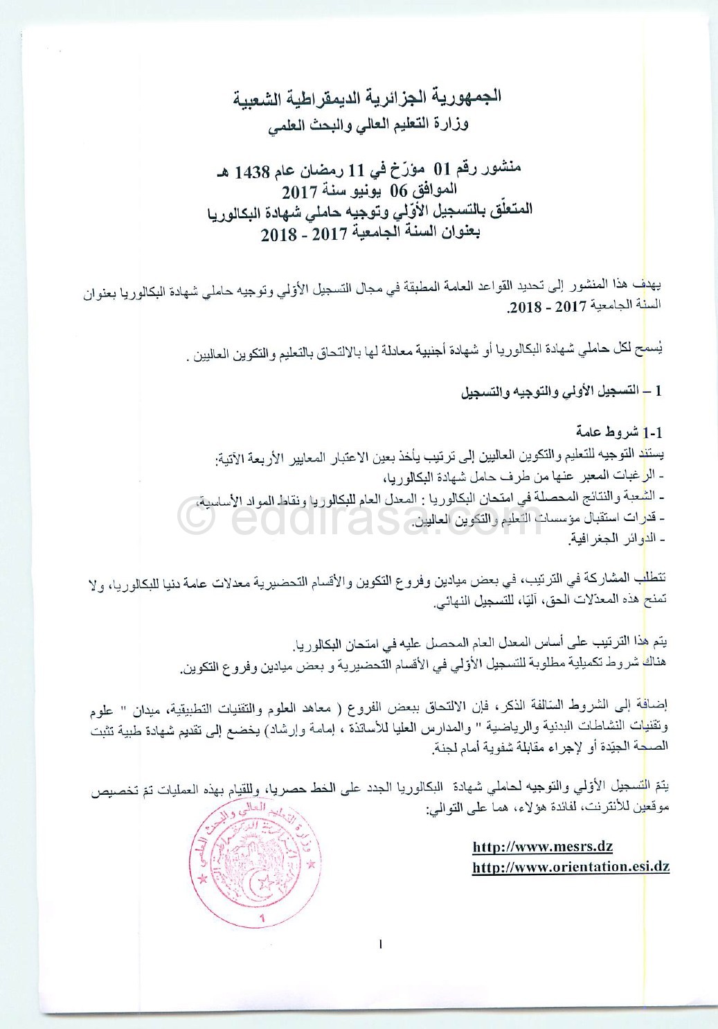 كل هذه الحالات ستتم معالجتها، حصريا، عن طريق أرضية إلكترونية خاصة بالتحويلاتprogres.mesrs.dz/webetu التي ستفتح من 05 إلى 06 سبتمبر 2017.